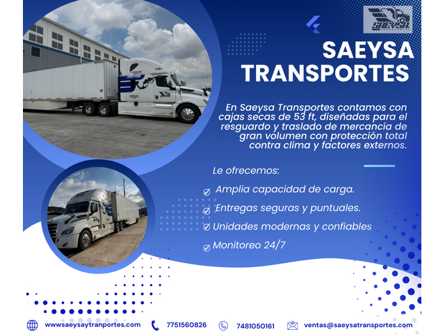 “Soluciones de transporte confiables para su empresa.” En Saeysa Transportes ofrecemos un servicio integral de transporte terrestre con: *Cajas secas de 53 ft para mercancía general y de gran volumen. *Plataformas de 48 ft Prácticas y seguras para mo...