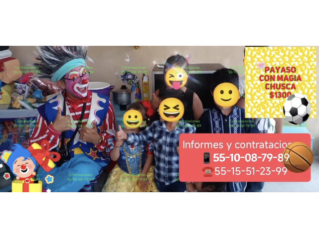 Hola! Paquetes disponibles: Una hora de show $1200* Hora de show y media hora de pintacaritas $1400* Payaso con 2 numeros de magia chusca $1300* Payaso con 20 obsequios adicionales $1500* Payaso con botarga $1800* BabyShawer una hora $1200* Dos payasos (titular y patiño) $2400. Payaso hora y media de show $1800* Payaso con ventrilocuo $1400* Payaso+pintacaritas+20 regalos adicionales+2 numeros de magia chusca+audio+animación de pastel y piñata+ sesion de fotos con el festejado $4000